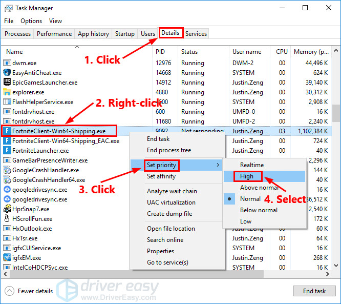 Try setting Fortnite to High priority in Task Manager to see if you can resolve this issue. Follow the instructions below to set Fortnite to the High priority: