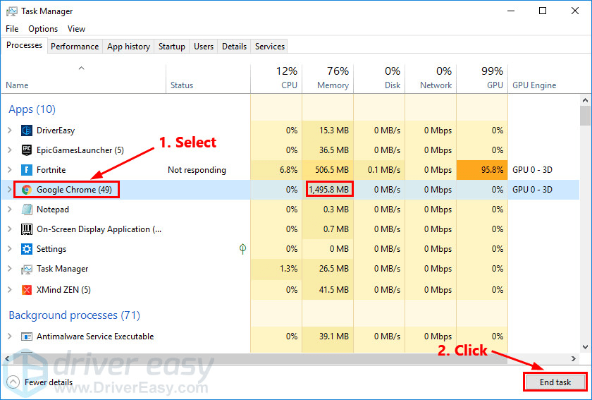 The Fortnite FPS drop issue may occur if you’re running some other applications or programs at the same time. So try restricting applications and downloads in the background before playing the game to see if this issue reappears. Here is how to do it: