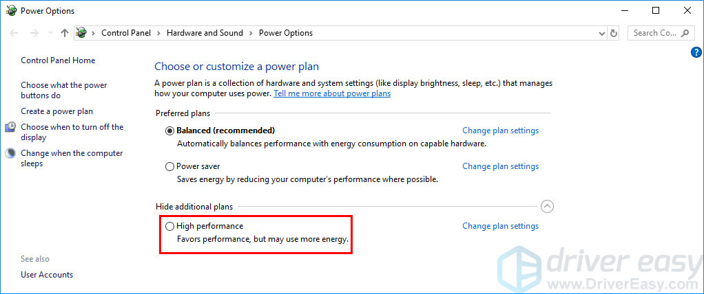 2. In the pop-up window, expand Hide additional plans and select High performance.