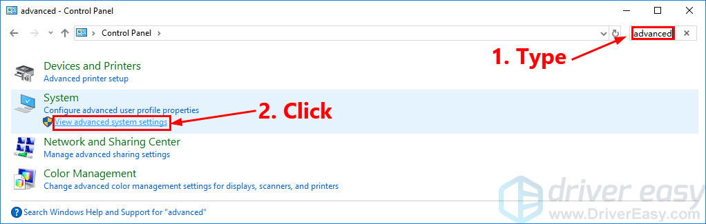 3. Type advanced in the search box in the upper-right corner and then click View advanced system settings.