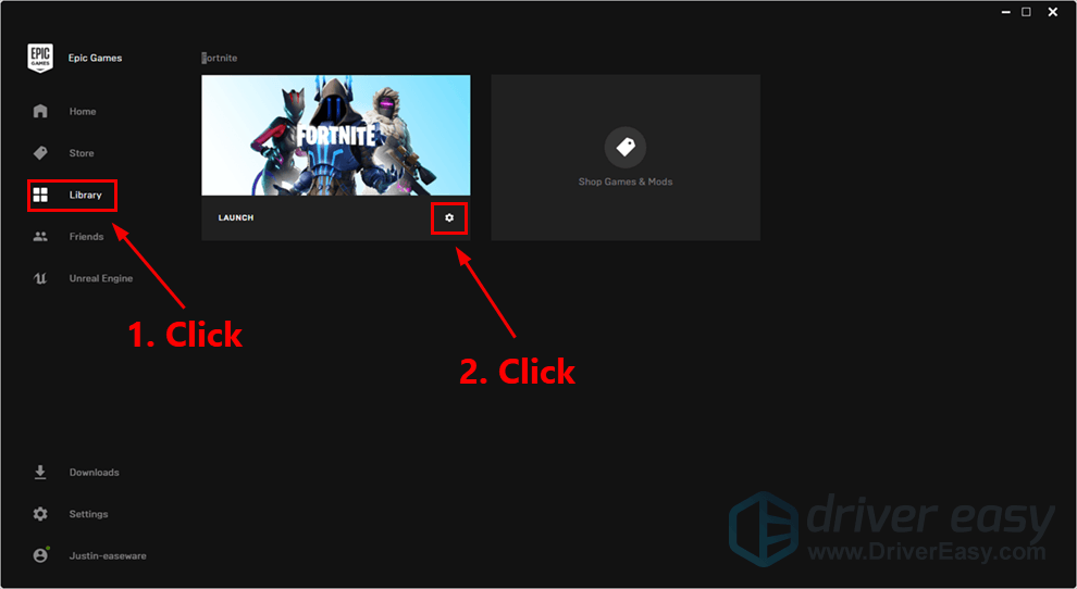 2. On the left panel, click Library. On the right, click the gear button on the lower-right corner of Fortnite.