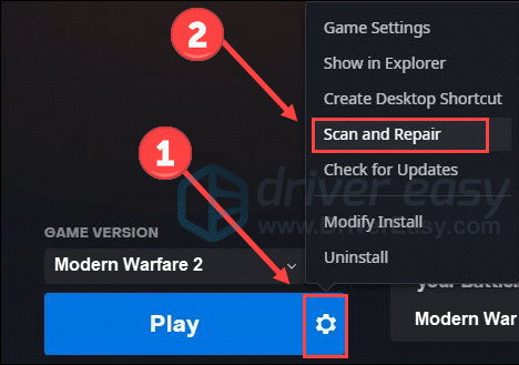 - Click the gear icon next to the Play button and then select Scan and Repair.