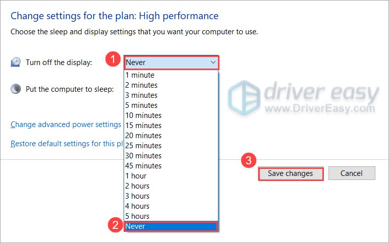 - Click the Turn off the display drop-down list and select Never. Then click Save changes.