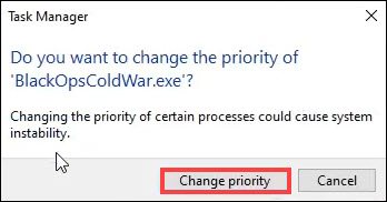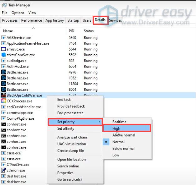 4) In the Details tab, the BlackOpsColdWar.exe program should be highlighted. Simply right-click it and select Set priority > High.