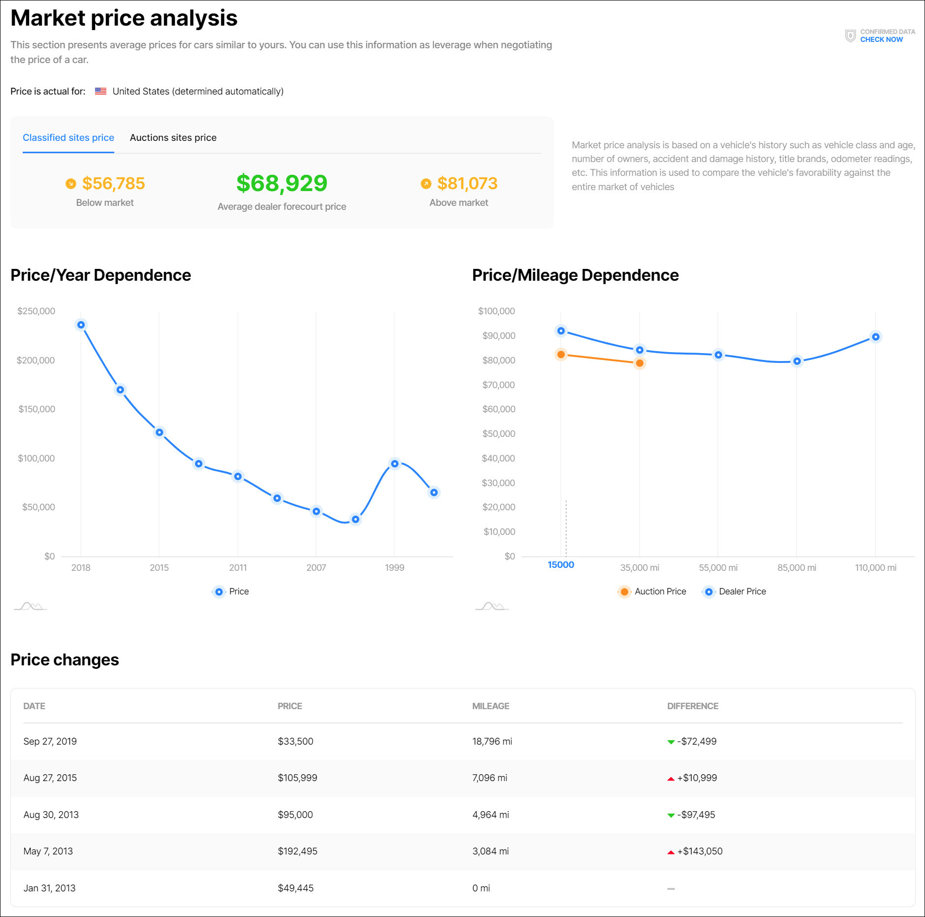 EpicVIN is a vehicle search service with high-tech analysis system. It’s also an approved data provider for NMVTIS and other 70+ official databases. For your car value calculation, it grabs real-time data from top auto traders and governmental records for your vehicle history. Then it shows the analysis results in AI generated charts. You may see the auction price range and the dealer price range, and also the price history for your car along with important factors.