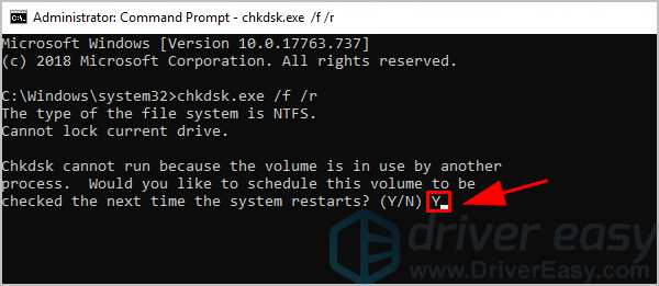 3) Type Y in the Command Prompt to confirm that you’d like to perform the disk check next time you restart your computer. Then press Enter.