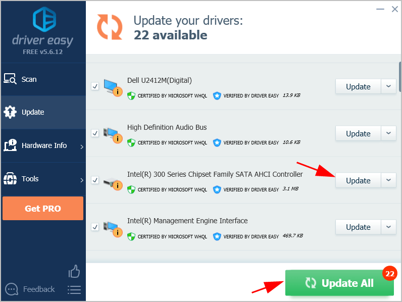 Or click Update All to automatically download and install the correct version of all the drivers that are missing or out of date on your system (this requires the Pro version – you’ll be prompted to upgrade when you click Update All).