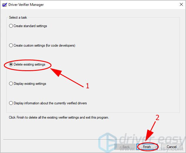 3) This will bring up Driver Verifier Manager. Select Delete existing settings, and click Finish.