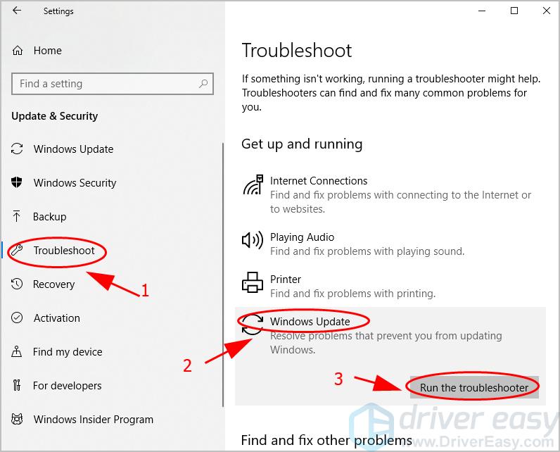 - Click Troubleshoot on the left. Click Windows Update > Run the troubleshooter.