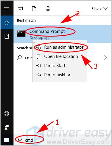 - Type cmd in the search box on your desktop, right click on Command Prompt and select Run as administrator.