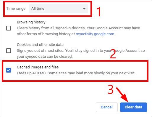 - Select All time or Everything for Time range, make sure Cache or Cached images and files is selected, and then click the Clear data button.