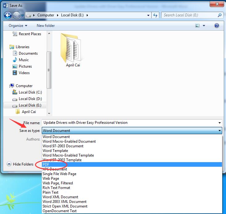 For Word 2013 users, click PDF from the drop-down list of Save as type.