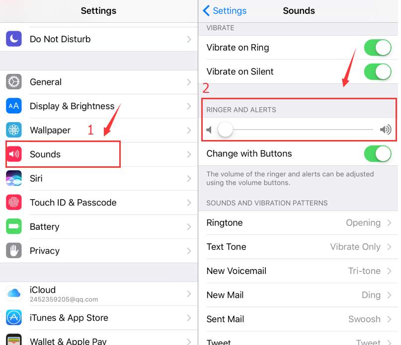 1) On your iPhone, go to Settings, then choose Sounds. Then drag the RINGER AND ALERTS slider to turn the volume up.