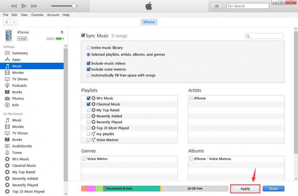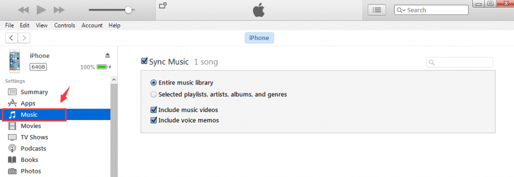 5) On the left side, choose Music tab under Settings. In the main iTunes window, click the box next to Sync Music to turn on syncing for that content type. If there’s a check in the box, syncing for that content type is already on.