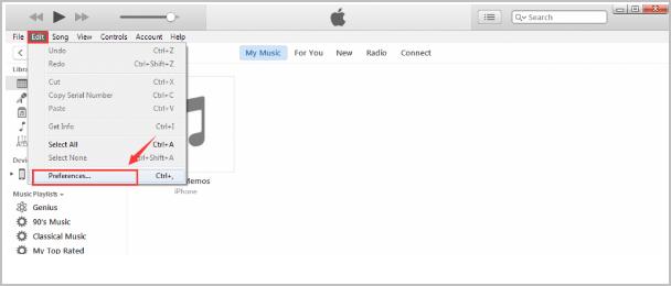 4) On your computer, go to iTunes window. From the menu bar at the top of the iTunes window, choose Edit > Preferences.