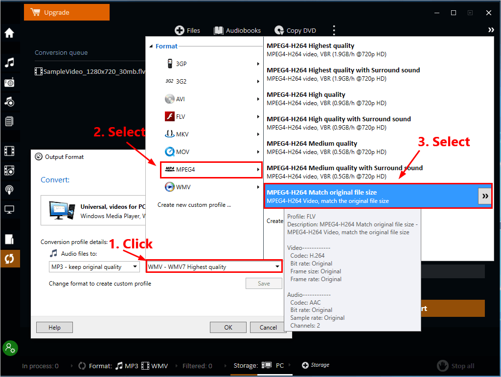 - Click WMV – WMV7 Highest quality under Video files to:, then select MPEG4 > MPEG4-H264 Match original file size.
